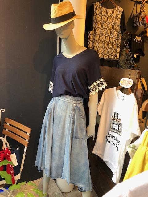 デザインニット 6900円 お袖にレースをあしらった今年らしいニットです💓 サラッサラーの着心地が堪りません💓 お色違いで朱赤もございます テンセルデニムのスカートもオススメですよぉ〜😃 2018年5月2日