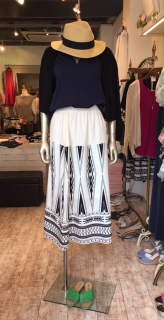 です。程よいエスニック柄が夏にぴったりのスカートと合わせて見ました。スカートは白と黒あり💖