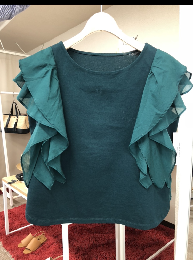 フリルトップス 8900円💓 二の腕を細ーく見せてくれる嬉しいデザイン💓 テイシャツ素材なので、吸湿性もあって爽やかな着心地です💓 フリルデザインのアイテムをワードローブに入れると旬の着こなしが楽しめますよぉ〜 今月はモスグリーンが人気カラーです⭐️ 2018年5月13日