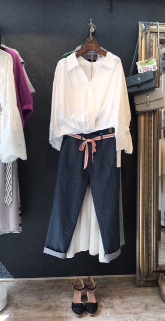 白シャツ ¥9,612 斜めに裁断されたフロント部分と、 シャーリングの裾がキュートな ブラウスです。 デニムはイタリア製🇮🇹 シャツ ¥9,612 デニム ¥10,584 サンダル¥11,880 2018年5月15日