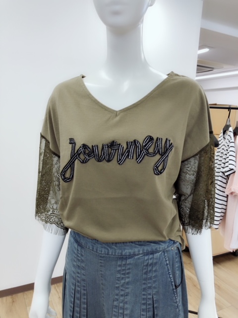 デザインTシャツ 7900円 英字のモチーフとお袖のレースが今年らしいTシャツがもうすぐ入荷します💓😍 お色は、こちらのカーキと白の2カラーです😊 しなやかで上質なカットソーです💓 2018年5月15日