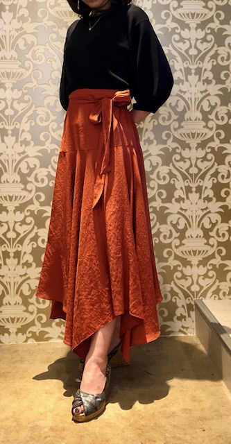 レンガ色のスカート SALE💓💓💓 サラッとした織り感のあるクオリティ高い素材のスカートが、大変お求めやすくなりました💓 2018オータムの注目カラーは、レンガ、グリーン、パープルです 今から履ける先取りアイテムですよぉ〜 組み合わせたボリューム袖のサマーニットも前回と編み地が変わって再入荷いたしました💓🙌 2018年7月5日