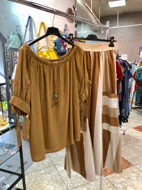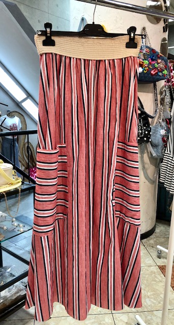 秋の一発目はモカ色💓 🇮🇹 ネックレス付きのリネントップスとマルチストライプのインポートスカートのコーディネートはいかがでしょう?💓😍 既に気持ちは秋色の方にぜひーーーーっ💓 とびっきりお洒落コーデです 来週入荷します 2018年7月5日