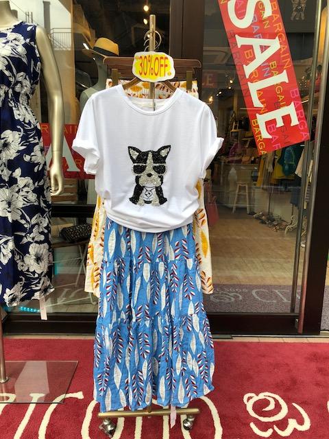 ワンチャンTシャツ 4838円💕 ちょっとワルな雰囲気のキラキラワンコがモチーフのTシャツです💓😍今回何と30%オフと大変お買い得になりました。 ハワイアンテイストのティアードスカートと合わせていかがでしょうか? ティアードスカート 5940円💓 2018年7月9日