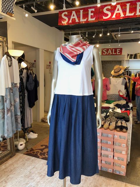 切り替えデニムワンピース 30%オフ 白のカットソーとサマーデニムの切り替えワンピースはいかがでしょうか? 丸洗いしてサラッと着られる💓 大変便利なワンピースです😃迷彩のスカートバージョンもございます ワンピース 7409円💓 2018年7月14日