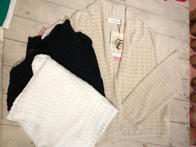 ボレロカーディガン 7690円💓 透かし編みがおしゃれなボレロカーディガンが、大変お得になりました😃💓 白、ベージュ、ブラックの3カラーで展開しております。ボリュームのガウチョやロングスカートと好相性👌大活躍しますよぉ〜 もちろんホームクリーニングOK🙆♀️です 2018年7月14日
