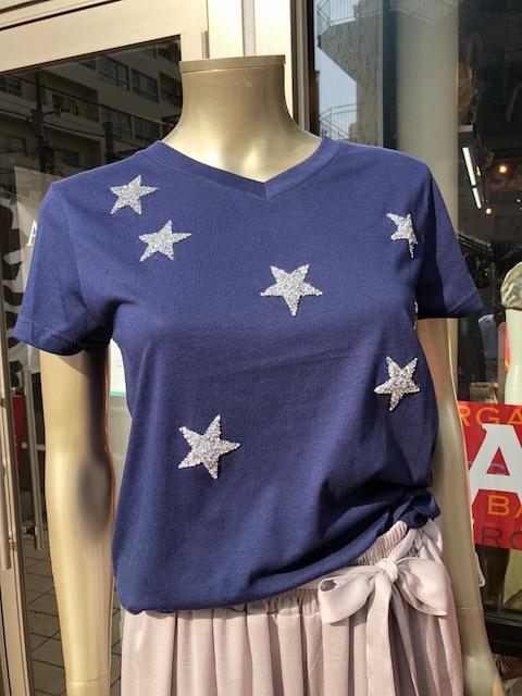 星のTシャツ 4460円💓💓💓 猛暑になったらやっぱりTシャツが大活躍ですね💓サラッと着心地の良い薄手のコットン素材に、キラキラのビジューがついてこの価格💕🎉💕 お洗濯は手洗いでOK💓 白、黒、グレー、ネイビーの4カラーで再入荷いたしましたーーーーー 店内のセール品が更にお値下げもスタートしております お得なアイテムをゲットされるなら今がチャンスですよん 2018年7月16日