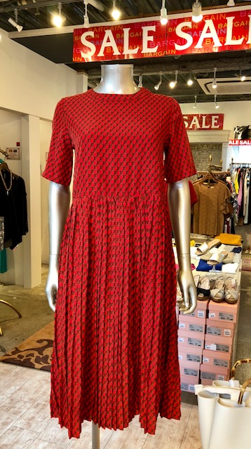 プリントワンピース 6900円 💕外税 お洒落なプリントのワンピースが入荷してきました💓朱赤とグリーンの2カラーです🤗 ポリエステル素材なのでお家でホームクリーニングOK🙆♂️ですよん 2018年7月26日