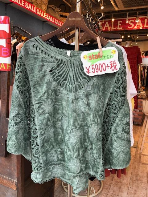 レースブラウス 5900円外税💕 製品染めのお洒落なブラウスが入荷して参りました💕白やネイビー、ブラックなどと合わせてシックなカラーで着こなせますよぉ〜 お袖もあってこの豪華なレース使いが堪りません🤗 2018年7月26日