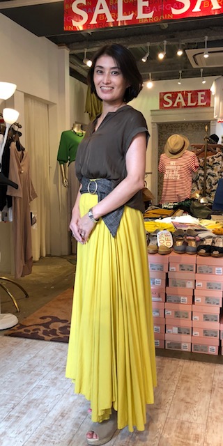黄色のマキシ丈スカート 10584円💓 黄色のマキシ丈スカートと、新作のカーキ色のブラウスをチェックのサッシュベルトでコーディネートさせて頂きました💕 贅沢なボリューム感と高級感でワンランク上の着こなしが楽しめますよぉ〜 スカートはネイビーもございます💓🤗 チェックのサッシュベルト 4212円 ブラウス 6728円 2018年7月30日