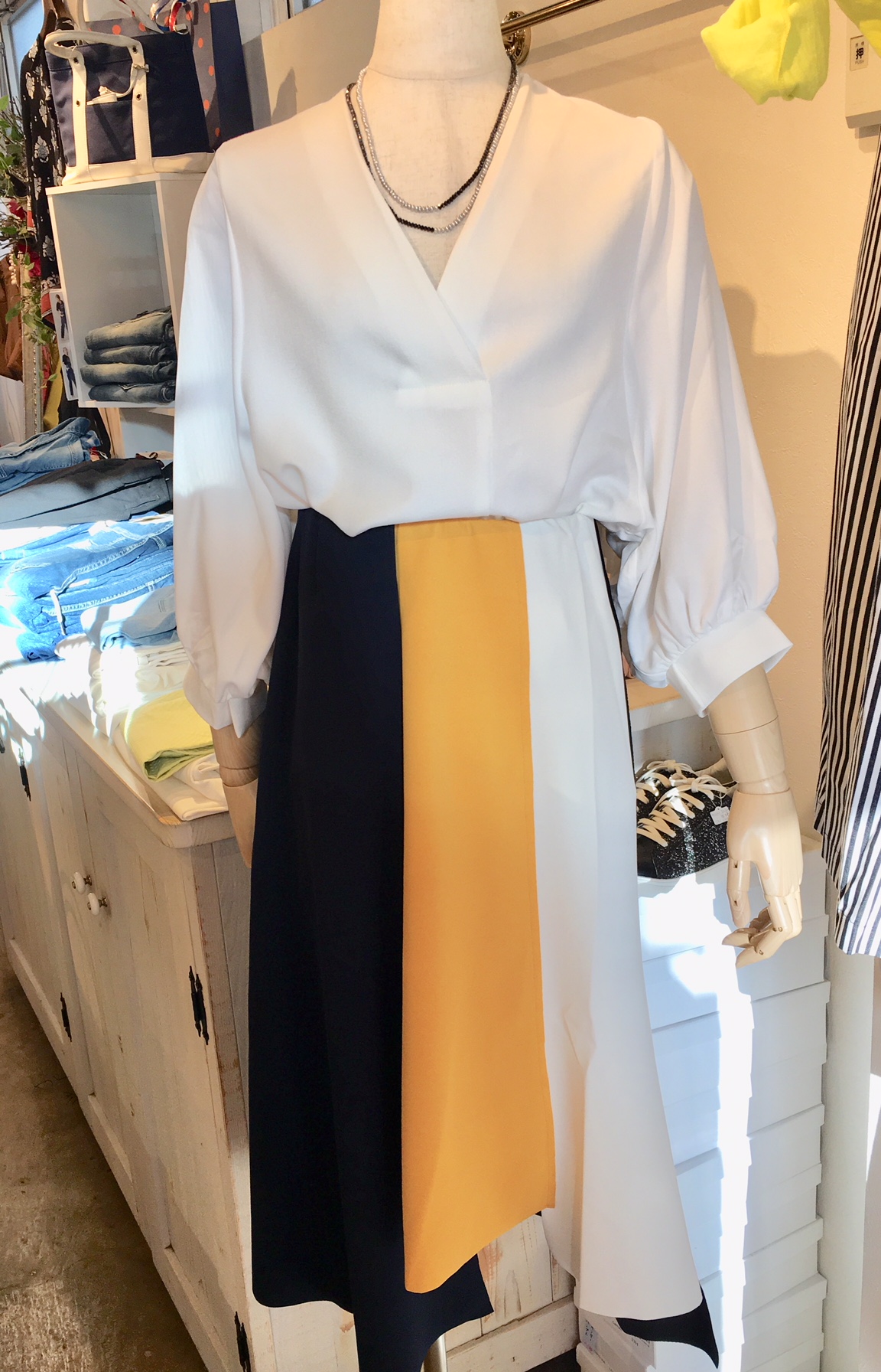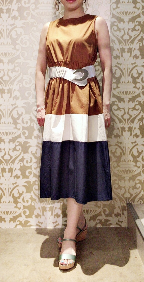 配色ティアードワンピース 8900円💓 晩夏に着たいコットン素材の秋色ワンピースはいかがでしょう?ブラウン✖️アイボリー✖️ネイビーの配色がとっても素敵です💕 今回はイタリーの太ベルトでウェストマークしてみました😃 黒ベルトや茶のベルトも素敵ですよん💓 2018年8月21日