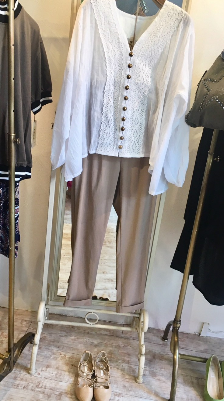 ストレッチの効いたテーパードパンツ ¥15,120 ガーゼコットンの刺繍ブラウス にもよく合います💖