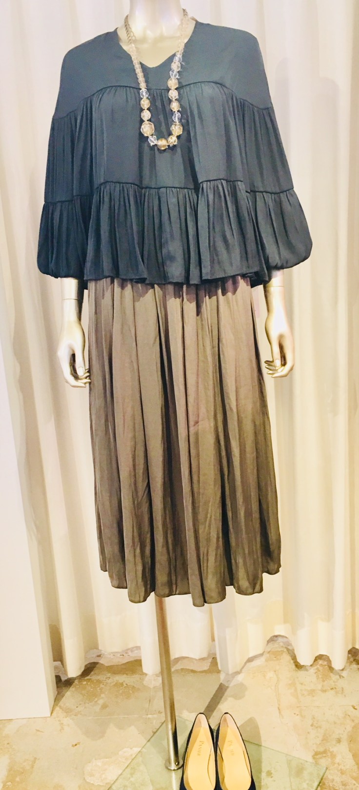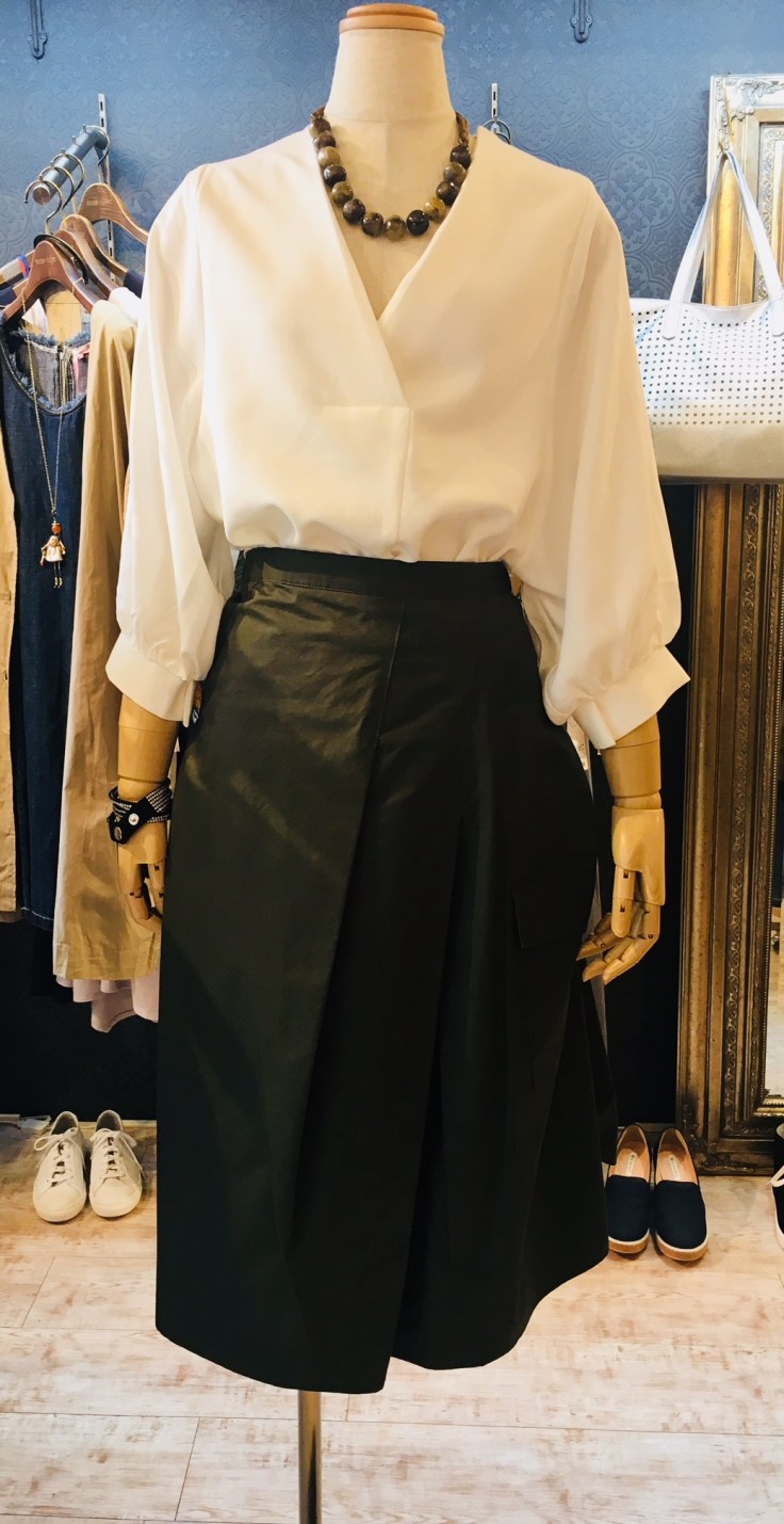 カーキのデザインスカート アシンメトリーに裁断された コットンのフレアスカートです。 単色でありながら個性的な一枚。 トップスにシンプルなものを 合わせても良く合います💖 スカート¥11,880 ニット¥12,960 2018年8月29日