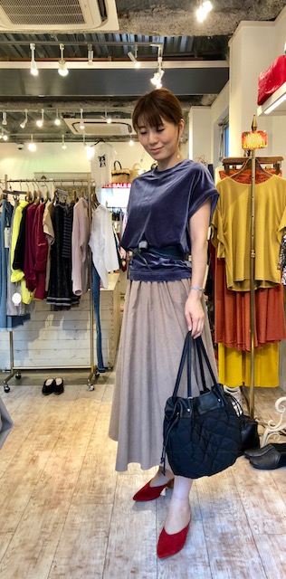 ベロアトップス 7900円💓 毎年人気の秋のベロアトップスが入荷しております💓🤗今年はチョイビッグシルエットが素敵です。伸縮してとっても着やすいですよぉ〜 ダークレッド、ネイビー、グレーの3カラーです タックスカート 6900円 ミュール 7900円 2018年8月30日