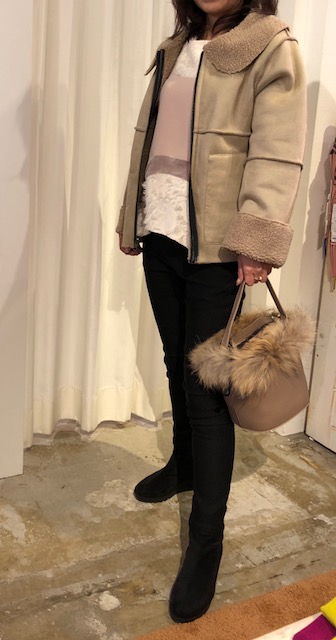 フェイクムートンのリバーシブルコート 18000円💓 とっても軽くって着やすいフェイクムートンのコートです🧥💓 ボアとスエード調の2WAYで着られるお得なコートです🤗 身長が150センチ代の小柄さんでもスッキリ着こなせますよぉ〜💕👍 ファーバッグ 8900円💓 パンツ 5900円💓 2018年9月30日