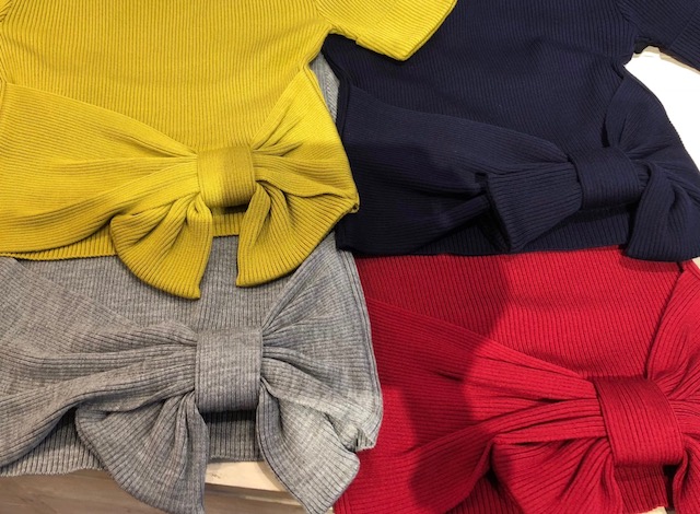 大人気のウエストリボンニット 4カラー 大人気のウェストにリボンのニットは、こちらの4カラーで入荷しております💓🤗 マスタード、グレー、レッド、茄子紺の4カラーとなっております❤️ どのカラーもステキですよぉ〜💕👍 2018年9月1日