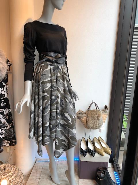 迷彩のスカート 11000円💓 アシンメトリーな裾がお洒落な迷彩のスカートを黒で引き締めてコーディネートしてみました😊💓こなれ感のある大人カジュアルコーデです。トップスをカジュアルにしたら、ハイカットのスニーカーを合わせてもgood💕 2018年9月14日