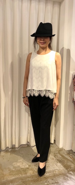 セットアップスーツ 19800円💓 裾レースがとってもステキなノースリーブブラウスと、ウェストゴムのテーパードパンツのセットアップです💓 上下別々に着られるのが魅力的です😊 帽子 5600円 ミュール 7900円 2018年9月14日