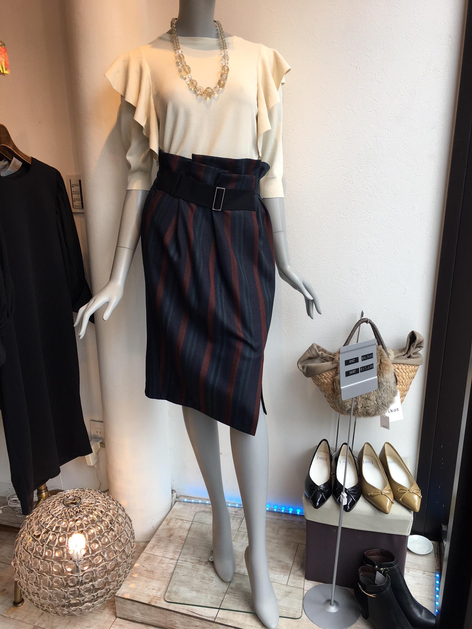 ウエストゴムのタイトスカートです。 グリーンとえんじ色のストライプがとっても お洒落♡