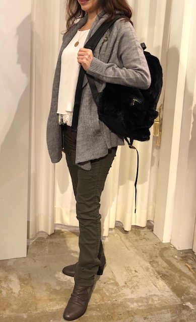 ニットアウター 5800円💓 ハーフ丈の使いやすいニットアウターが大人気です😃💓 軽くって暖くて、プチプラなのです フェイクファーのモコモコリュックもお洒落です💕 カーキのカーゴパンツ 13000円 2018年10月7日