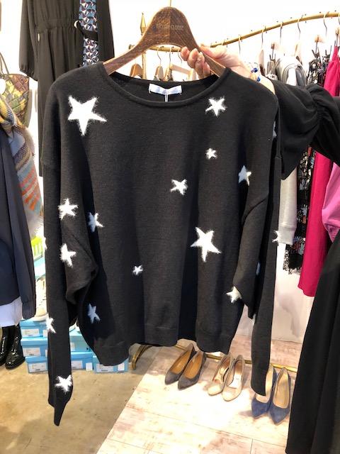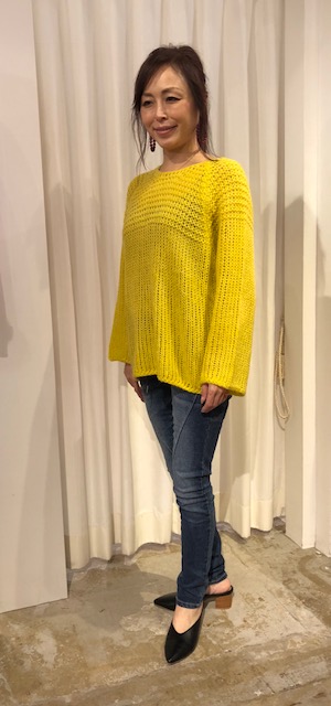 デザインニット 12800円💕 ザックリした編み地がステキなデザインニットです💕😍お色違いのミルクベージュもステキです👌ヒップが隠れる着丈も嬉しい一枚 デニム 13800円 ミュール 7900円 2018年10月11日