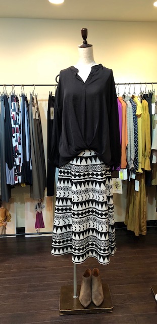 エスニックモチーフのニットスカート💓 今期はニットのボトムスが大人気です💓😃 こんなエスニックなロングスカート ならとってもエレガントに着られそうです💓😃 カラーは、お写真の黒✖️グレーの他に、黒✖️マスタードもございます 明日12日の入荷予定です エスニックニットスカート 14000円 シフォンブラウス 9900円 2018年10月11日