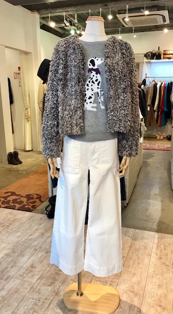 101匹ワンチャンニットのコーディネート💓 白黒モノトーンのワンちゃんが可愛すぎるニットと、白のワイドパンツ、ブークレジャケットのアウターでスタイリングしてみました💓😃🙌 透けない白のワイドパンツは、S〜Lのおサイズで店内しておりますーーー冬の白も素敵ですよぉ〜💓💓💓 ブークレジャケット 14000円 ニット 11000円 パンツ 12800円 2018年10月16日