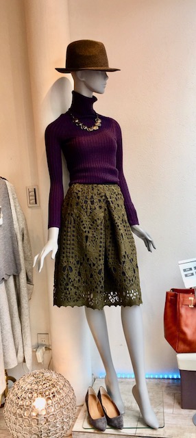 パープル✖️モスグリーン💕💕💕 ステキなカットレースのスカートが大人気です💓😃 この秋、グリーンやパープルは注目カラーですので、こんな組み合わせなら旬の着こなしを楽しめます〜⭐️👌😍 合わせた神戸ニットメーカーの上質なウール100%ニットはウォッシャブルで、着心地が抜群です💕ステキなカラーを是非見にいらしてくださいませ スカート 8900円 タートルニット 9800円 2018年10月17日