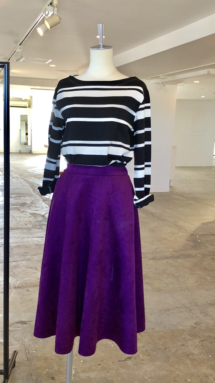 ボーダートップスとパープルのスカート💓 ストレッチ素材のフェイクスェードのスカートは何と6900円💓💓💓 ウェストにゴムが入っていて何たって履きやすいのです👌💕 シックなボーダーのカットソーでコーディネートしてみました⭐️ スカートはキャメルカラーもございます 2018年10月17日