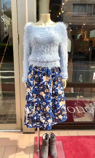 綺麗なフラワープリントスカート💓 膝下丈のフラワープリントのスカートが入荷しました〜😍😍 フェザーニットに合わせて💓💓 お色違いでグリーンもございます✨ ニット 11.000円 スカート 9.800円 2018年10月24日