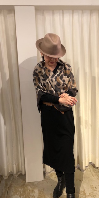 ストール France🇫🇷 6600円💕 シックなレオパードプリントがステキなストールは、フランス🇫🇷インポートアイテムです モカベージュの中折れ帽子と合わせて黒のセットアップをスタイリングしてみました💕 ハット 5600円 チャコールグレーもございます 2018年11月3日