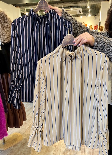 ストライプハイネックブラウス 15000円💕 首回りを華やかにしてくれるハイネックデザインのブラウスです💕 首がきついのが苦手な方でも、緩やかなゴム使用なので快適です😃 今年マルチストライプをぜひ一枚揃えてみてください💕着こなしの幅が広がりますよぉ〜 ネイビーとベージュの2カラーです 2018年11月3日