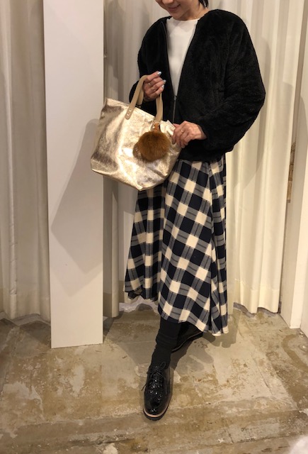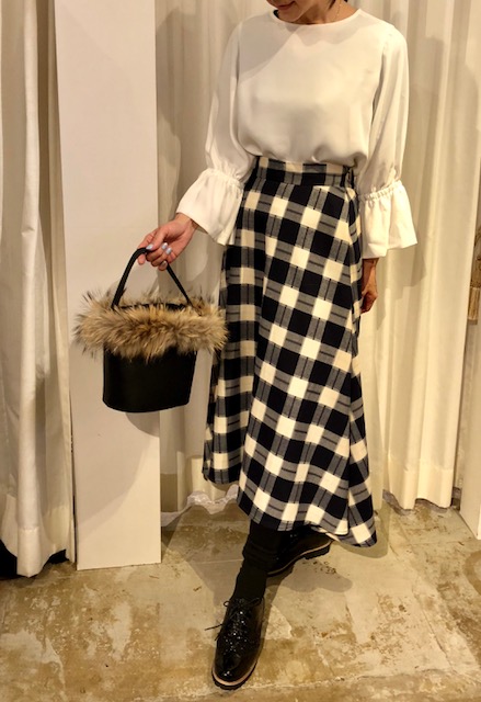 チェックスカート 10800円💓 新作のブロックチェックのスカートが入荷しました💓😃白地に黒の爽やかなブロックチェックが素敵です⭐️ 軽くてしなやかな着心地ですよー💓 キラキラビジューおじ靴 7900円 ファーバッグ 8900円 2018年11月13日