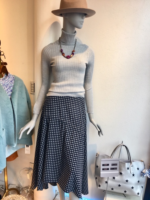 チェックのフレアスカート チェックのフレアスカートは 前が短く、後ろが長くなっています。 女性らしいライン💖 トップスにはシンプルな タートルネックを合わせてみました。 タートルネックニット¥9,800 スカート¥11,800 2018年12月26日