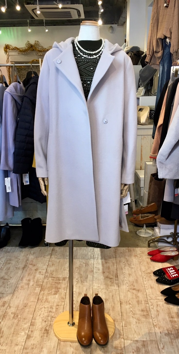 フード付き、アイスグレー色のコートです。