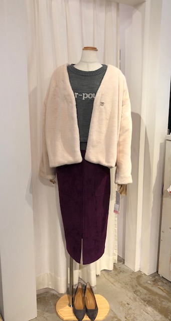 フェイクファージャケット 30%オフ💕 アイボリーの可愛いフェイクファーのアウターが入荷しております💕😃 ふわふわっと暖かくてとっても軽い⭐️⭐️⭐️ 春先にも大活躍しますよぉ〜 ネイビーとライトグレーもございます タイトスカート 7900円💓 2019年1月10日
