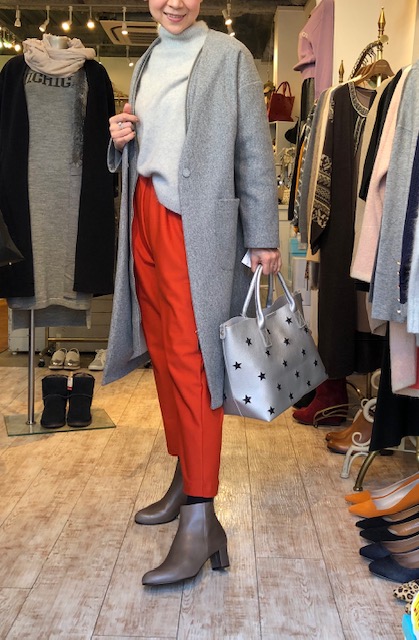ノーカラーコート 11900円💕 本日は新作の暖パンが入荷して参りました😃🙌裏ボア素材でとっても暖かなテーパードパンツ💕ラクーンのニットとノーカラーコートをグレーにして、エッジの効いたコーディネートはいかがでしょう⭐️👌 パンツはブラックとアイボリーも入荷しました。 テーパード暖パン 8900円 ニット 16800円→10080円💓 星のトートバッグ 6900円 2019年1月20日