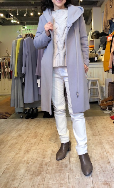 フード取り外し可能な2wayコート 25200円💕 しなやかなウール素材の上質なデザインコートが大変お求めやすくなりました💓😃 フードを取り外して、ノーカラーのVネックコートにもなるスグレモノ💕💕💕 お色違いで、ライトベージュ、ネイビー、ブラックがございます。 白の暖パン 8960円💕 本革ブーツ 18500円💕 2019年1月20日
