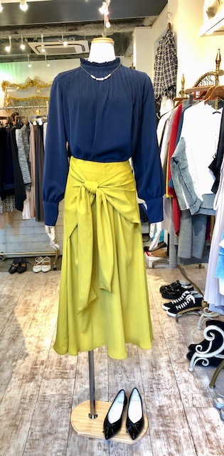 セミフレアスカート 14000円💕 大人気のスタンドブラウスと爽やかなイエローでコーディネートしてみました💕😃 ネイビーのブラウスは、ONにもOFFにも大活躍しますよぉ〜 ブラウス 6900円 スカート 14000円 シューズ 9800円 2019年2月8日