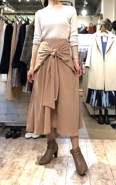 ベージュのワントーンコーディネート💕 春らしい日差しも感じられる今日この頃🌸🌸🌸新しい春のスカートはいかがですかーー? セミフレアで前リボンのデザインが女らしくて素敵です💕😊お色違いで明るいイエローもございます ニット 7900円 リボンデザインスカート 14000円 2019年2月8日