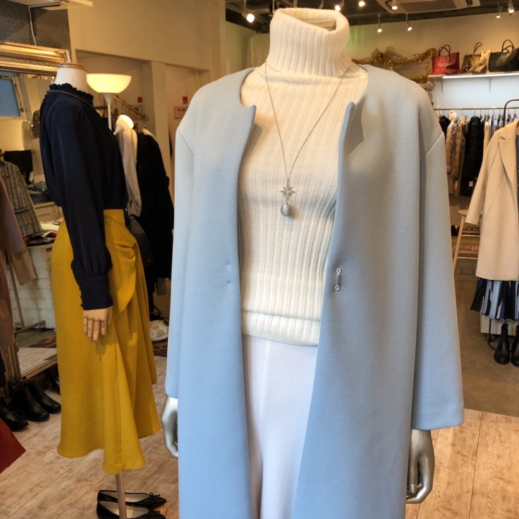 サックスブルーのノーカラーコート 19000円💕 軽くて着やすいノーカラーコートが入荷して参りました💕😃 春の冷たい風がを避けるコートは必需品💕ですよぉ〜 お色違いはグレーがございますーー😍 2019年2月8日