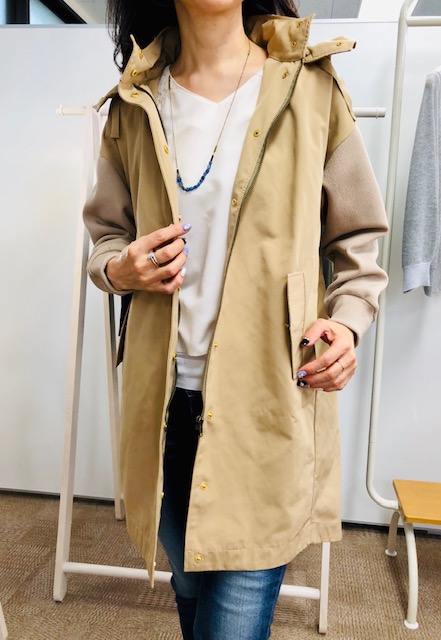フード付きフィールドコート 17000円💕 お袖がリブ素材になったとても着やすいスプリングコートです💕😃 アーム周りがゆったりしておりますので、インナーにポリューム袖のアイテムを着ていただいてもスッキリ💕大きめのポケットも嬉しい🎉 お色違いはカーキがございます🌸 2019年2月14日