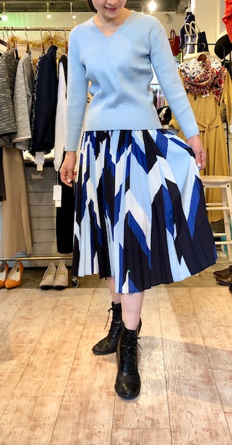 幾何学柄のプリーツスカート💕 春らしいプリントがステキなプリーツスカートは、ウエストがゴムでとっても楽チンな履き心地💕💕💕 シンプルな春ニットと合わせてもブラウスと合わせてもステキです👌 Vネックニット 4130円 2019年2月19日