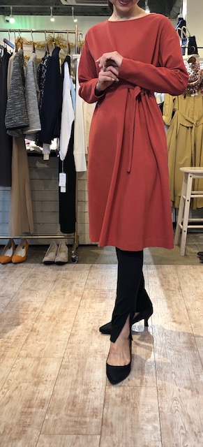 ワンピースとレギンスのコーディネート💕😍 こちらはスモーキーなオレンジカラーがお洒落なワンピースです💕ウェストのベルトでスタイルアップ👌⭐️⭐️⭐️ 少し厚めの生地感なので、春先の気温にはピッタリなのです😃 合わせたパンプスはソールがふかふかして革部分もソフトな仕様です💕 24センチの他に少し在庫がごさいますので、おサイズは店頭までご連絡くださいませ🙌 ウェストベルトワンピース 12800円💕 パンプス 8900円💕 2019年2月19日