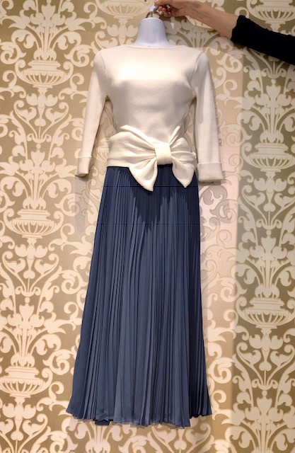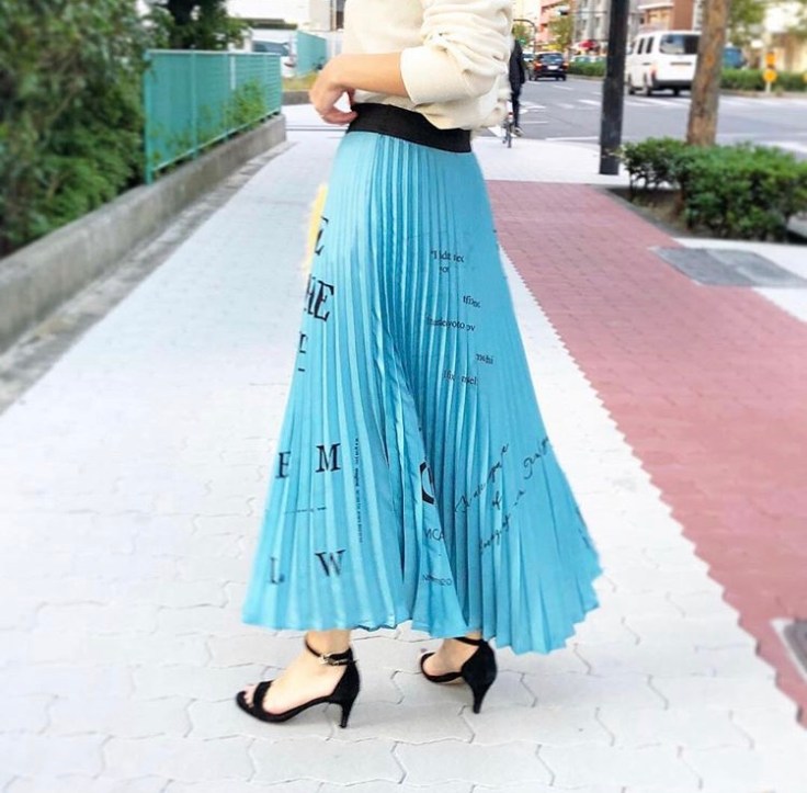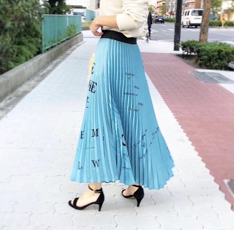 メッセージロゴプリーツスカート 11800円 爽やかなブルーのプリーツスカートにオリジナルの英字のロゴプリントがお洒落なスカートですお色違いでブラックに白の英字のタイプもございます 平ゴムの仕様でスッキリ着られて、素材はシワにならない形状記憶プリーツとなっております 2019年2月25日