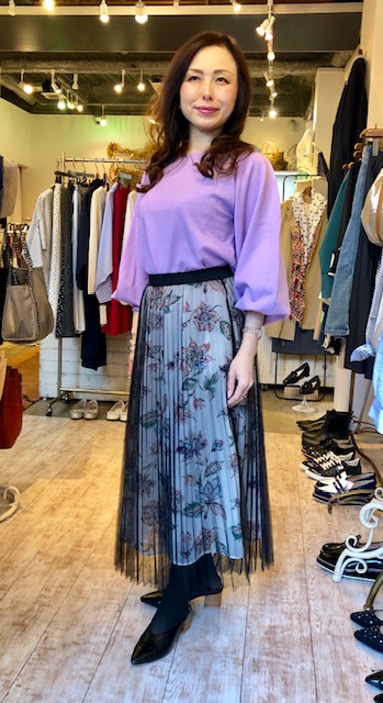 ラベンダー色のニットとプリーツスカート💕 プリントとチュールをプリーツ加工したとっても素敵なスカートが、白と水色で入荷しております💕💕💕 気になる方はぜひリコノクローシェ にお出かけくださいませーー ラベンダー色のニット 5900円 白、黒、グリーンもございます 2019年3月10日