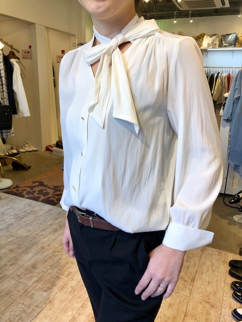 ボウタイブラウス 13000円🌸 とろみ素材のボウタイブラウスは、おリボンにも、タイにもなるアイテムです💕🥰 取り外して、スッキリしたVネックのブラウスにもなります🌸 お色違いのペールグレーと、白地に黒のストライプもございます💕 一年中大活躍しますよぉ〜😃👍 2019年3月11日