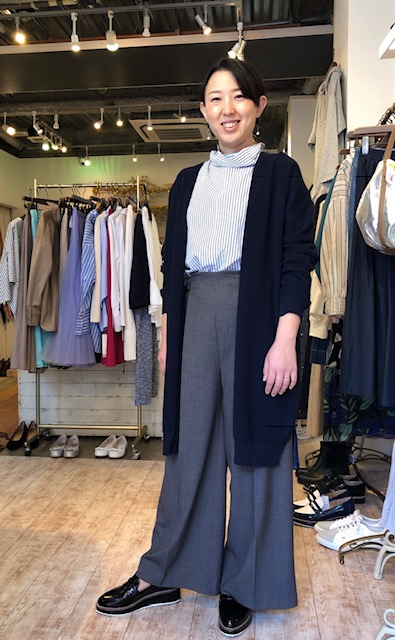 ワイドパンツのコーディネート🌸 さらっと履きやすいセンタープレスのワイドパンツにストライプのブラウスとネイビーのロングカーディガンで合わせてみました💕 カーディガンはグレーのお色もございます💕🌸 ブラウス 5900円 パンツ 12800円 2019年3月12日