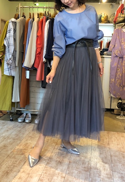 ブルーのブラウスとチュールスカート💕 ブルーのブラウスは今年人気のアイテムです💕 グレー、ベージュ、ブラック、ネイビーと何にでも合わせやすくて、新鮮なカラー配色がお洒落なのです💕💕💕 お写真のブラウスは、ベージュと2カラーとなっております🥰 2019年3月15日