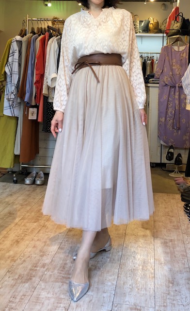 レオパードブラウスとチュールスカート💕 華やかな光沢感のあるレオパードのブラウスと同じシャンパンベージュカラーのチュールスカートをブラウンのベルトで引き締めたコーディネートです💕😃 今期のチュールスカートは大人も着られる高級感漂うアイテムが揃いました🌸ぜひトライしてみてくださいね😃 2019年3月15日